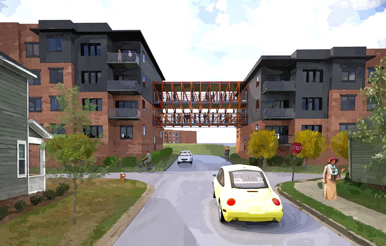 The residential community within Greenville’s Water Tower District will expand the positive energy of Hampton Station to a 24/7 Live/Work/Play experience. Located on the Orange Line of the Swamp Rabbit Trail, the Water Tower Apartments will provide residents with great bicycle connectivity to the nearby Swamp Rabbit Grocery, downtown Greenville and Furman University. The industrial character of the immediate surrounds provides the design cues, while the active lifestyle experience inspires the amenity package. Well Building Challenge concepts are integrated throughout the design and made obvious with conveniently located dramatic stairs while elevators are discreetly tucked away. Outdoor spaces include a roof terrace overlooking the terrace and the Swamp Rabbit Trail that is connected to a chef’s kitchen for entertaining and a dramatic oversized bridge that expands on the industrial aesthetic.