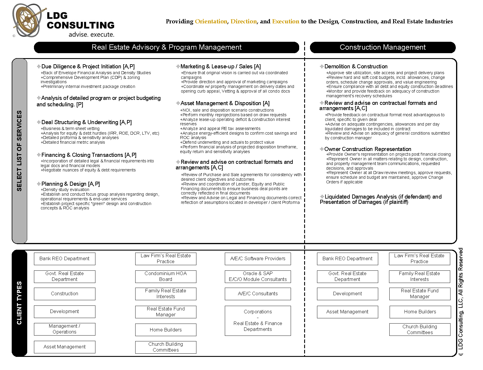 I originally met Alrich Lynch through our mutual involvement in ULI several years ago. As I got to know him, I was impressed with his real estate acumen, his large company development experience, and his detailed understanding of the complexities of various real estate financing structures. I have worked with Alrich both as a General Contractor reporting to him in his Program Management role for the Owner on a multi-family rehab project and, a few years later I hired Alrich to do financial modeling and other consulting work on new, ground-up mixed use development. No matter which side of the table he is on, Alrich is fair, knowledgeable, and trustworthy. He also has a great demeanor which makes it easy to work with him. I would highly recommend Alrich Lynch and LDG Consulting without reservation or qualification.
